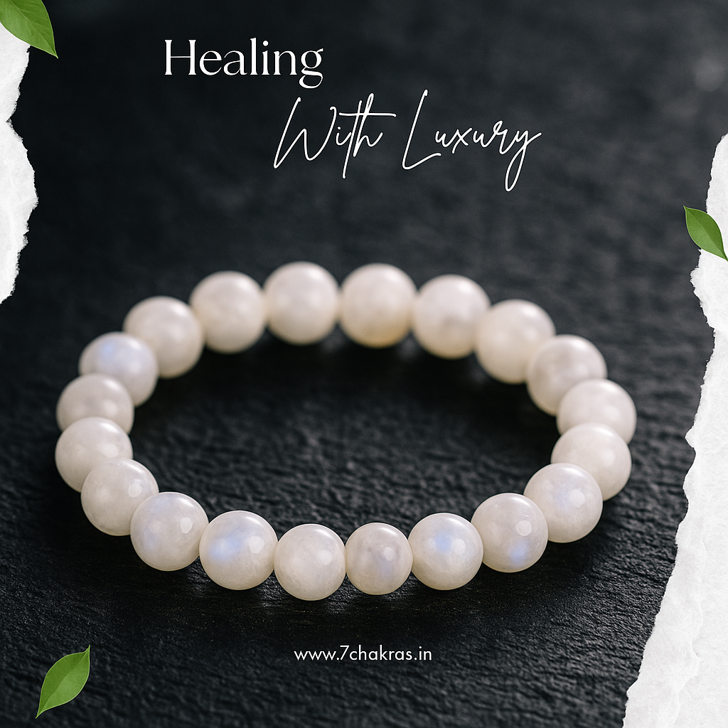 Embrace divine feminine energy and emotional balance with our Moonstone Bracelet from 7Chakras.in. Known as the "Stone of New Beginnings", moonstone helps enhance intuition, calm the mind, and align your inner energies. This bracelet is beautifully handcrafted using natural moonstone beads, perfect for meditation, healing, or daily spiritual wear.